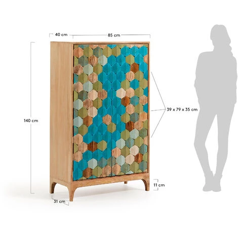 Armoire avec structure en bois de manguier massif naturel et portes sculptées avec finition multicolore.