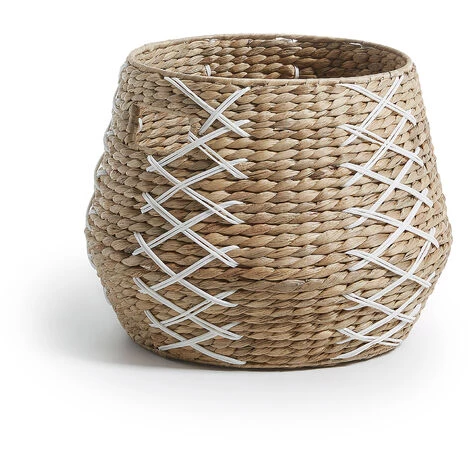 - Panier en jacinthe d’eau naturelle avec détail tressé en plastique blanc.