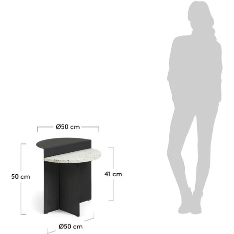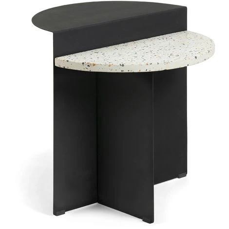 Table d’appoint avec plateau en terrazzo et structure en métal.