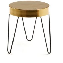 La table Juvenil est un exemple parfait du black & gold match. Son plateau en acier est peint à la main par pulvérisation en doré et sa structure est composée de trois pieds en métal noir en forme d’arches pour une plus grande stabilité. All design.