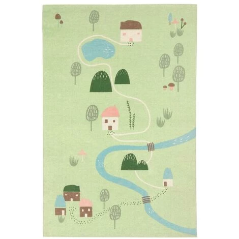 Tapis Llaru 100% coton vert maisons et arbres multicolore 90 x 130 cm